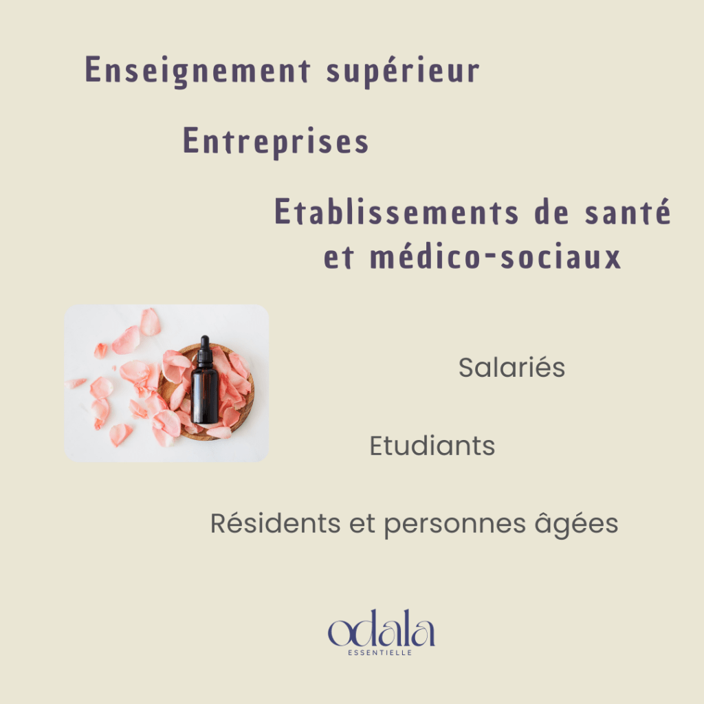 Faites découvrir l’aromathérapie sensible et l’utilisation des huiles essentielles en olfaction pour accompagner les émotions, la créativité, la concentration, la mémoire, et la connaissance de soi et des autres dans le cadre de la qualité de vie au travail.
